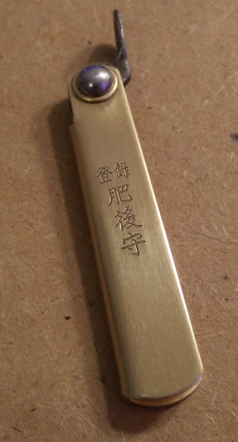 The higonokami is a traditional Japanese folding knife. It is s friction folder with a one piece handle made of brass. The blade is some sort of high carbon steel and a hamon (temper) line is visible when held at an angle.